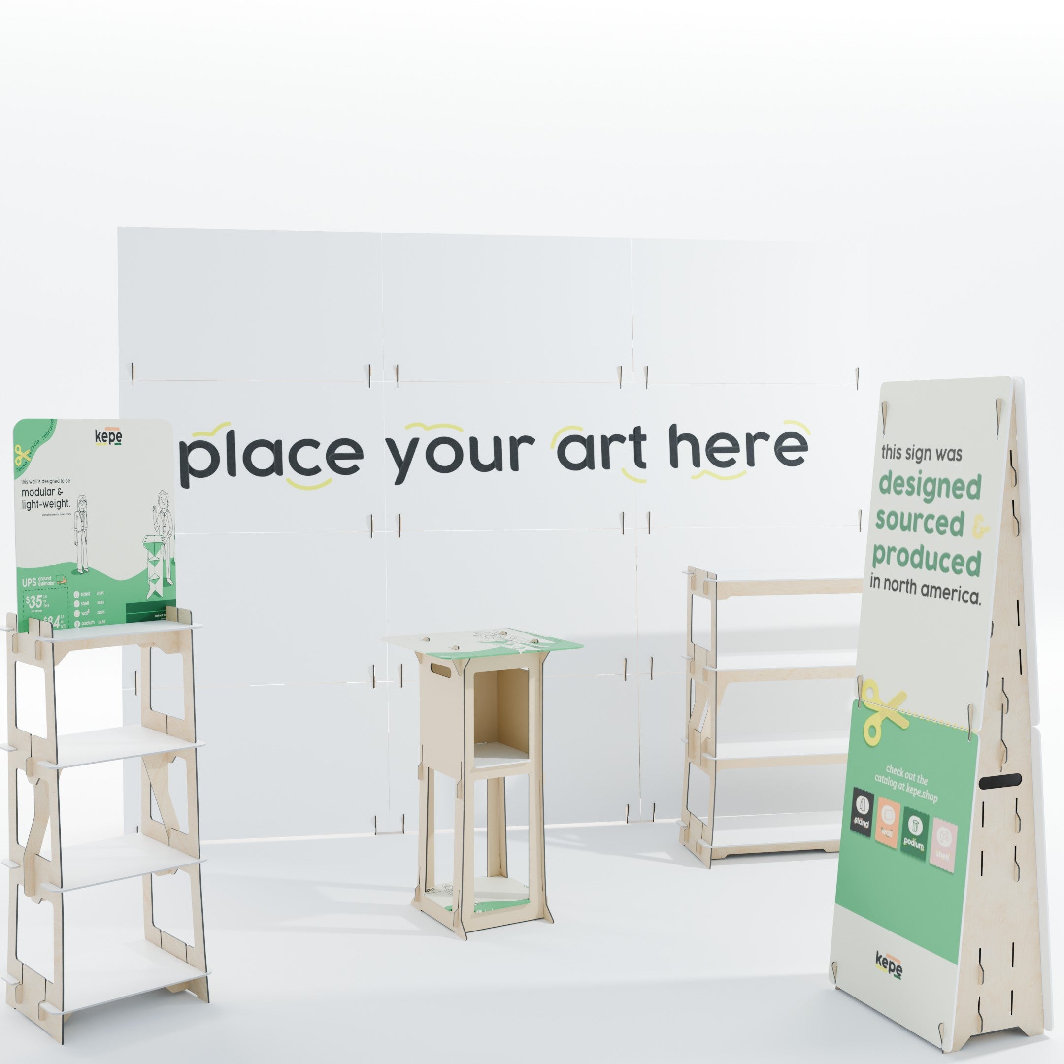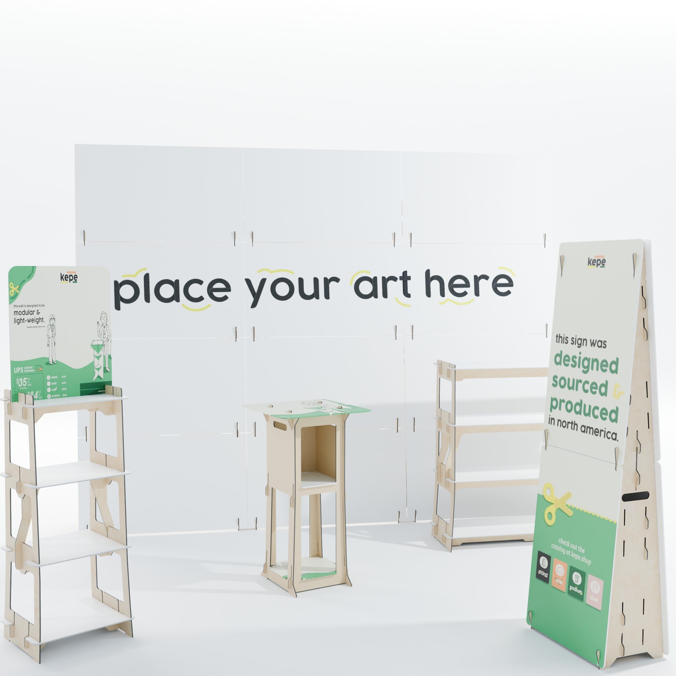 Create an inviting, cohesive, and eco-friendly booth setup for your 10' x 10' space with the Kepe Modular Display System. Designed to make a bold yet sustainable statement, this curated setup features everything you need for a polished presentation: the Kepe Display Backwall, two versatile Narrow Display Shelves, one Kepe Podium, and a double-sided Banner Stand. Each component is sustainably crafted in California using falcon board and plywood, embodying modern design principles while prioritizing environmental responsibility.